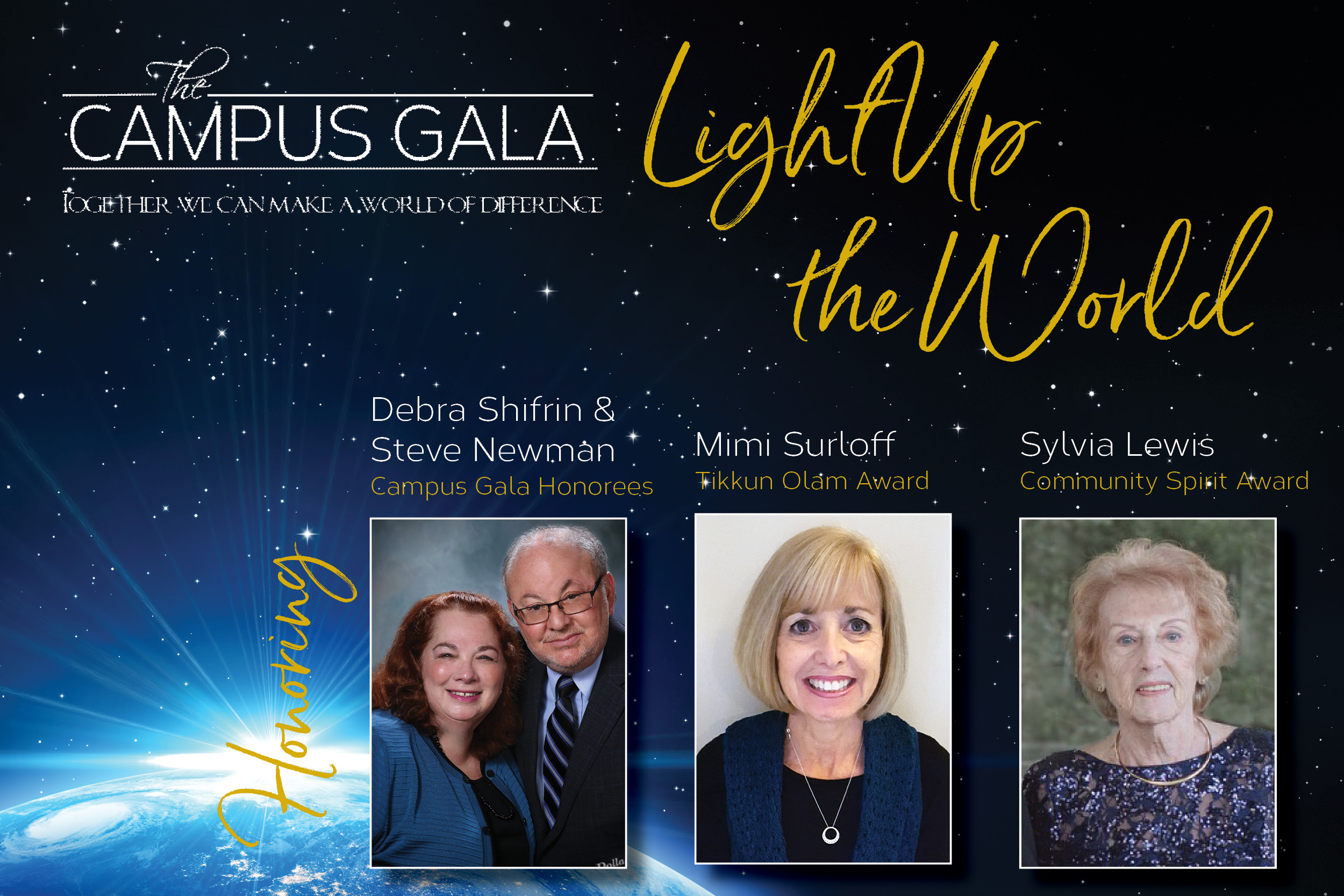 On Saturday, November 4, the Campus Gala will shine a light on four community members: Debra Shifrin and Steve Newman, Mimi Surloff and Sylvia Lewis. Please join us as we honor their respective devotion to our community. Individual tickets are $150. Please reserve by Friday, October 27. Call Jody Faught at 330-835-0025, email her, or register online. Proceeds benefit The Shaw JCC of Akron, The Lippman School and Jewish Family Service of Akron. Together, we can make a world of difference.