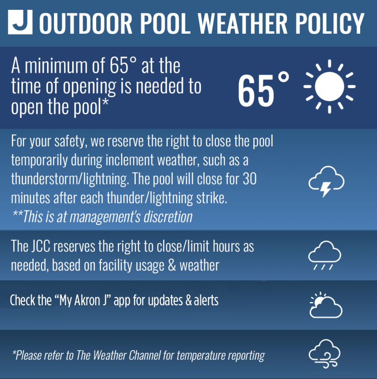 The National Lightning Safety Institute recommends waiting at least 30 minutes after the last sound of thunder is heard before resuming activity in the water for pools. The Shaw JCC indoor and outdoor pools are connected by underground pipes and pump systems, so we follow this rule year-round. In the case of thunder or lightning, swimmers may be asked to exit the indoor and outdoor pool areas for at least 30 minutes. In the event that American Red Cross Swim Lessons are taking place during this time, students will be offered a safety instructional class. Classes will not be canceled or rescheduled due to instructor availability. Prior to arriving at the Shaw JCC, please check our “My Akron J” app or call 330-867-7850 to inquire if the pools are open in case of inclement weather.