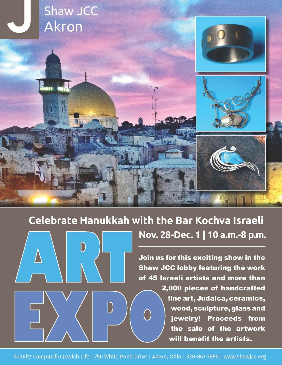 The Bar Kochva Israeli Art Expo is free and open to the community. Shopping hours are 10 a.m.-8 p.m, Monday, Nov. 28 through Thursday, Dec. 1, in the lobby at the Shaw JCC of Akron, 750 White Pond Drive. Proceeds from the sale of the artwork will benefit the artists.